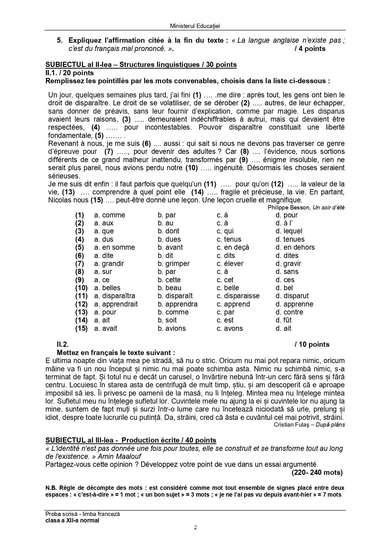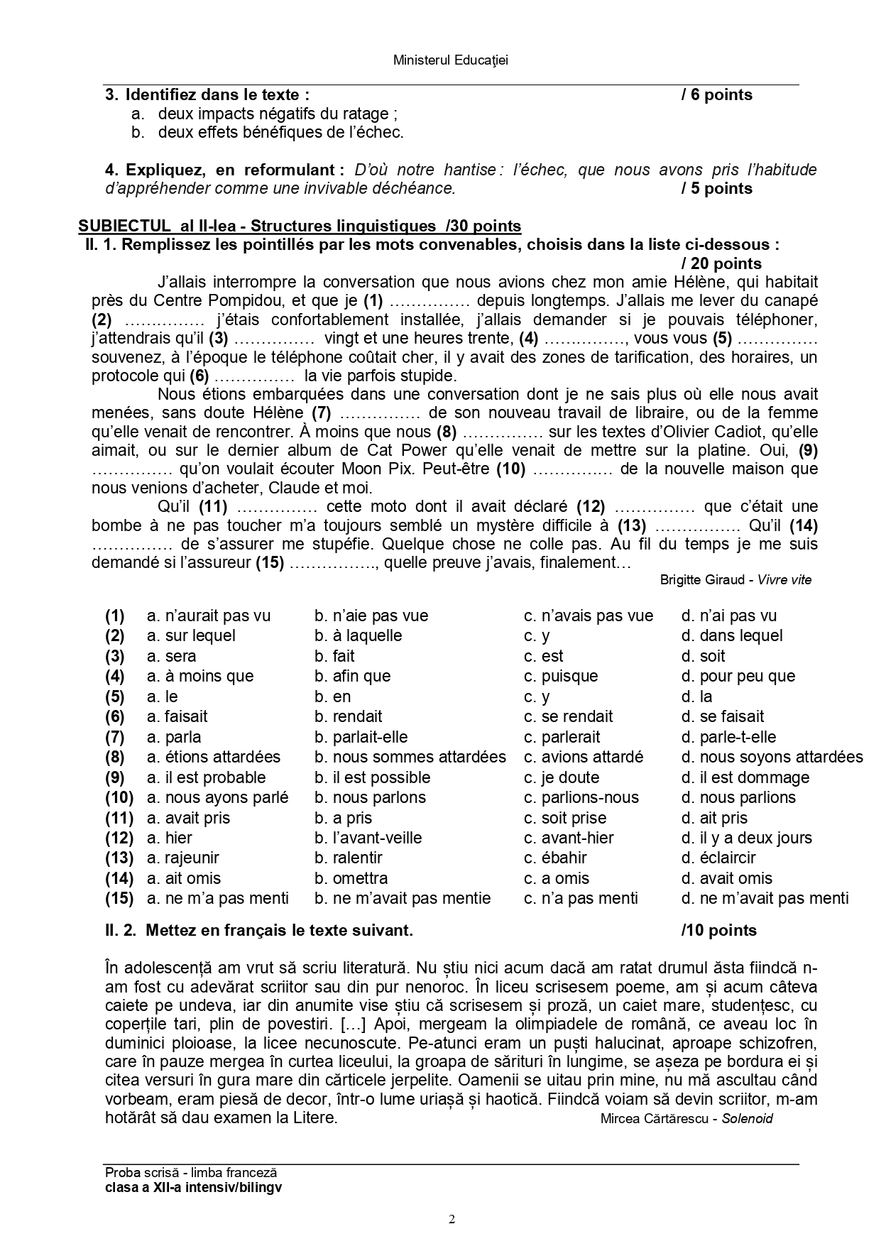 Subiect – clasa a XII-a Bilingv: