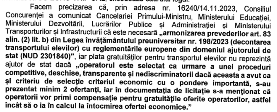 „În situatia în care CJ Botoşani a încheiat contracte care nu sunt atribuite conform Regulamentului (CE) nr.1370/2007, respectiv atribuite prin procedură competitivă sau, dacă licitaţia nu poate fi finalizată, prin procedură de negociere fără publicare, pe motive de urgenţă, conform prevederilor din legislaţia achiziţiilor publice, plata gratuităţilor pentru transportul elevilor reprezintă o măsură care implică ajutor de stat şi nu o măsură de suspendare a plăţii, care trebuie avizată de către Consiliul Concurenţei prin parcurgerea de către Consiliul Judetean Botoşani a procedurii naţionale în domeniul ajutorului de stat, cu modificările şi completările ulterioare”, se mai arată în răspunsul ANRSC.