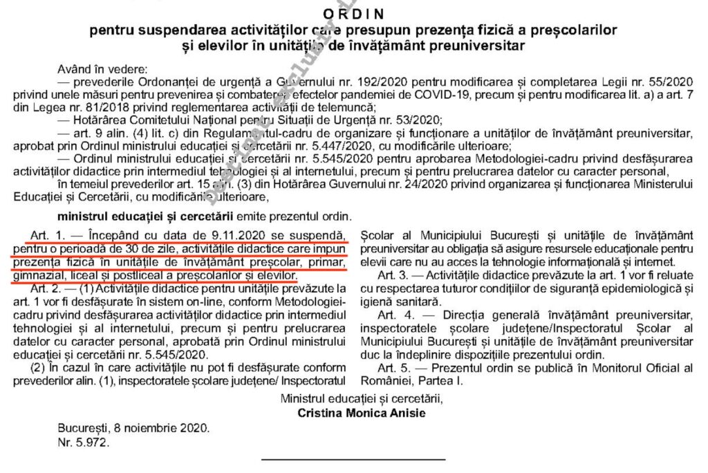 “Art. 1 Începând cu data de 9.11.2020 se suspendă, pentru o perioadă de 30 de zile, activitățile didactice care impun prezența fizică în unitățile de învățământ preșcolar, primar, gimnazial, liceal și postliceal a preșcolarilor și elevilor.
