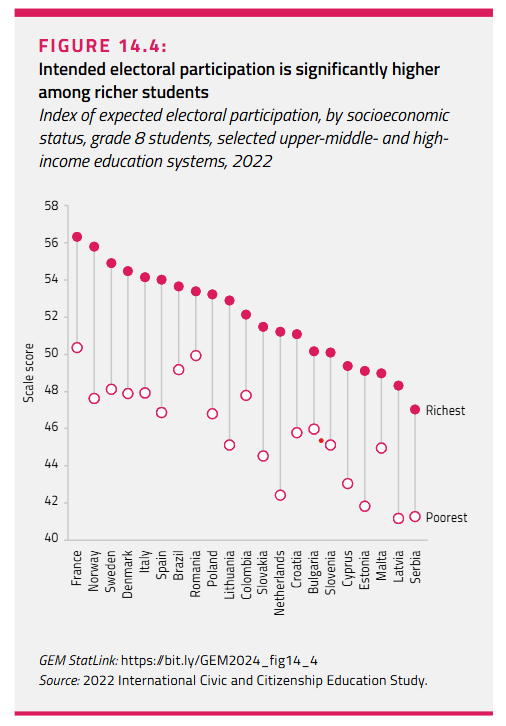 Totuși, evaluările ICCS (International Civic and Citizenship Education Study) din 2016 și 2019 au identificat legături între nivelul cunoștințelor civice și indicele participării politice.