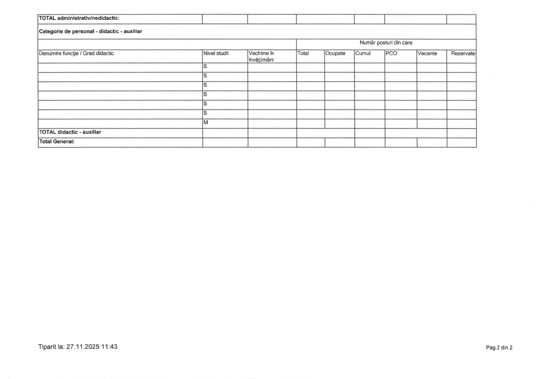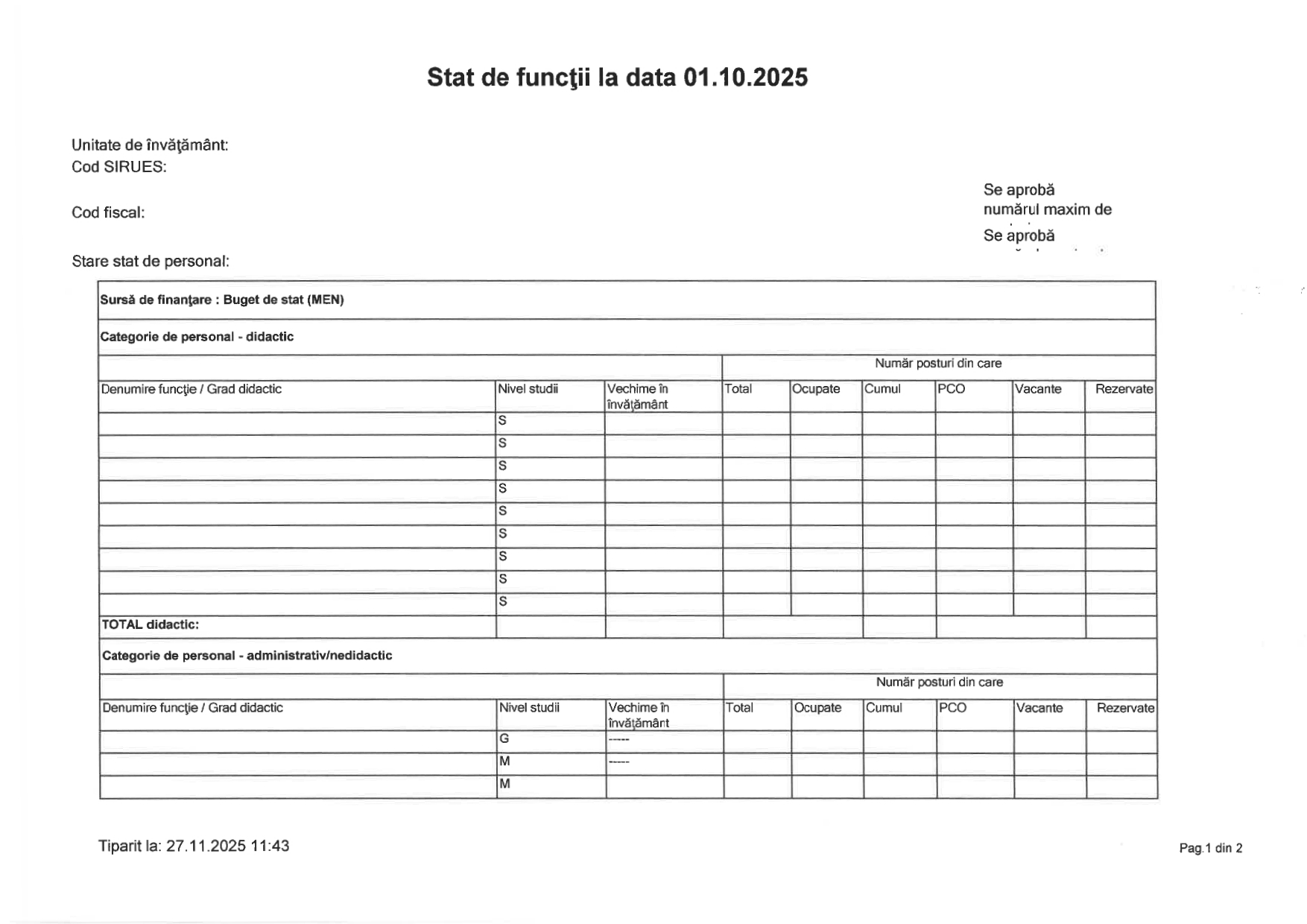 Pentru statul de funcții, școlile au de transmis următoarele date: