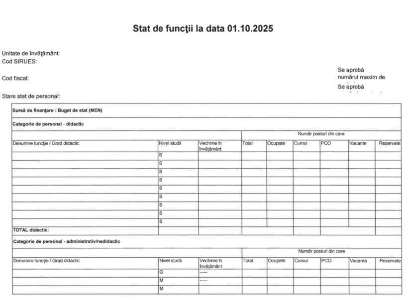 Pentru statul de funcții, școlile au de transmis următoarele date: