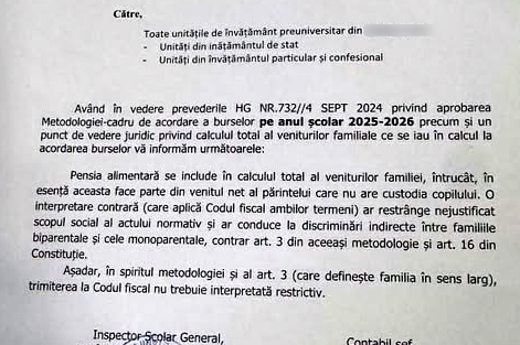 Un inspectorat școlar a transmis către toate unitățile din județ o adresă în care afirma că pensia alimentară ar trebui inclusă în veniturile familiei pe motiv că „face parte din venitul net al părintelui care nu are custodia copilului”. Documentul invoca o interpretare „în spiritul metodologiei”, sugerând că prevederile Codului Fiscal ar fi secundare.