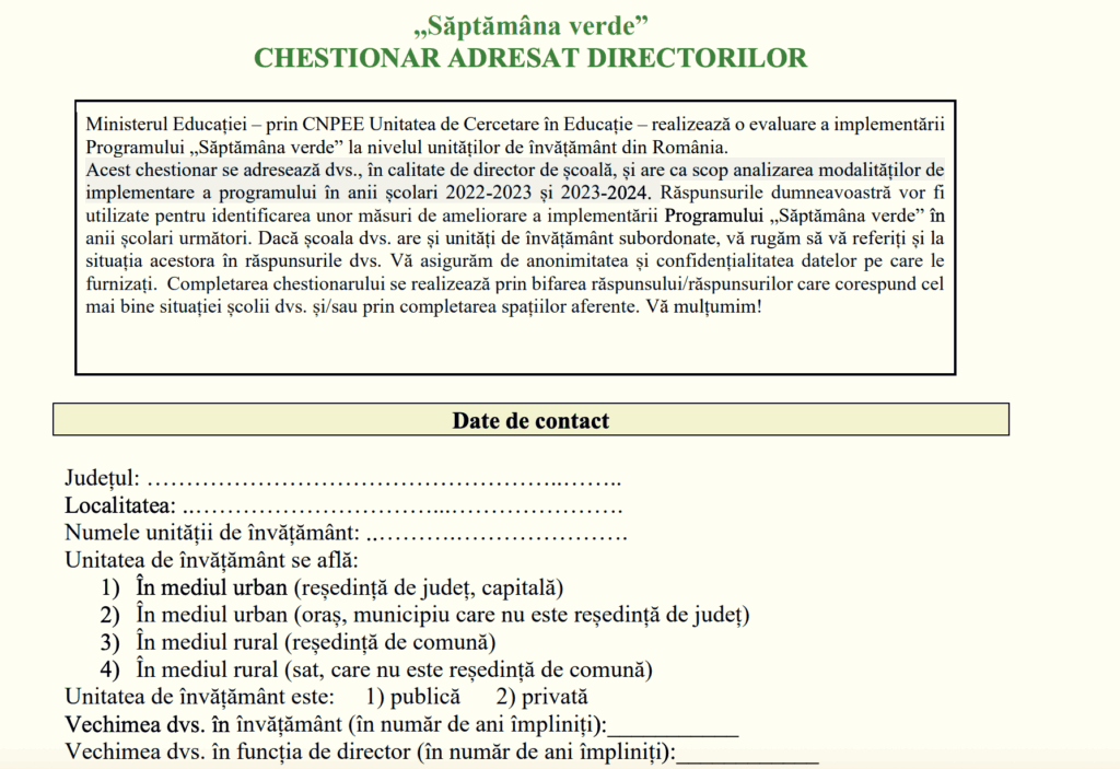 Directorii și profesorii chestionați în raportul de cercetare Evaluarea Programului „Săptămâna Verde” reclamă mai multe dificultăți în implementarea programului, în primul raport de evaluare al programului, cerut de Ministerul Educației și realizat de Institutul de Științe ale Educației. Spațiile de vizitat sunt aglomerate pentru că multe școli aleg aceeași perioadă, nu sunt bani pentru activități și e prea multă birocrație, spun cadrele didactice și directorii. La cercetare au răspuns 255 de directori dintre care 60% sunt din mediul urban, peste 2.600 de profesori și învățători și aproape 10.000 de elevi. Chestionarele pot fi consultate la finalul articolului.