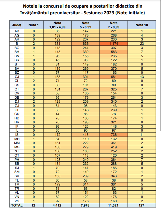 Reamintim că Ministerul Educației, prin inspectoratele școlare, a scos la concurs în acest an peste 6.800 de posturi titularizabile. Cele mai multe sunt pentru educatoare. Pentru a obţine statutul de titular (angajarea pe perioadă nedeterminată), candidații trebuie să obţină minimum nota 7 (şapte) la proba scrisă. Pentru angajarea pe perioadă determinată (suplinire), candidaţii trebuie să obţină minimum nota 5 (cinci) la proba scrisă.