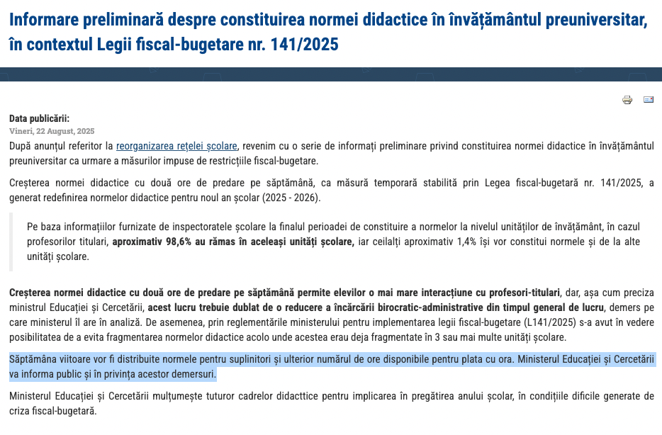 Vineri, 22 august: „Săptămâna viitoare vor fi distribuite normele pentru suplinitori și ulterior numărul de ore disponibile pentru plata cu ora. Ministerul Educației și Cercetării va informa public și în privința acestor demersuri”.