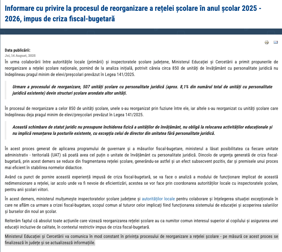 Joi, 14 august, anunțul că 507 școli se desființează ca școli cu personalitate juridică: „Ministerul Educației și Cercetării va comunica în mod constant în privința procesului de reorganizare a rețelei școlare – pe măsură ce acest proces se finalizează în județe și se actualizează informațiile”.