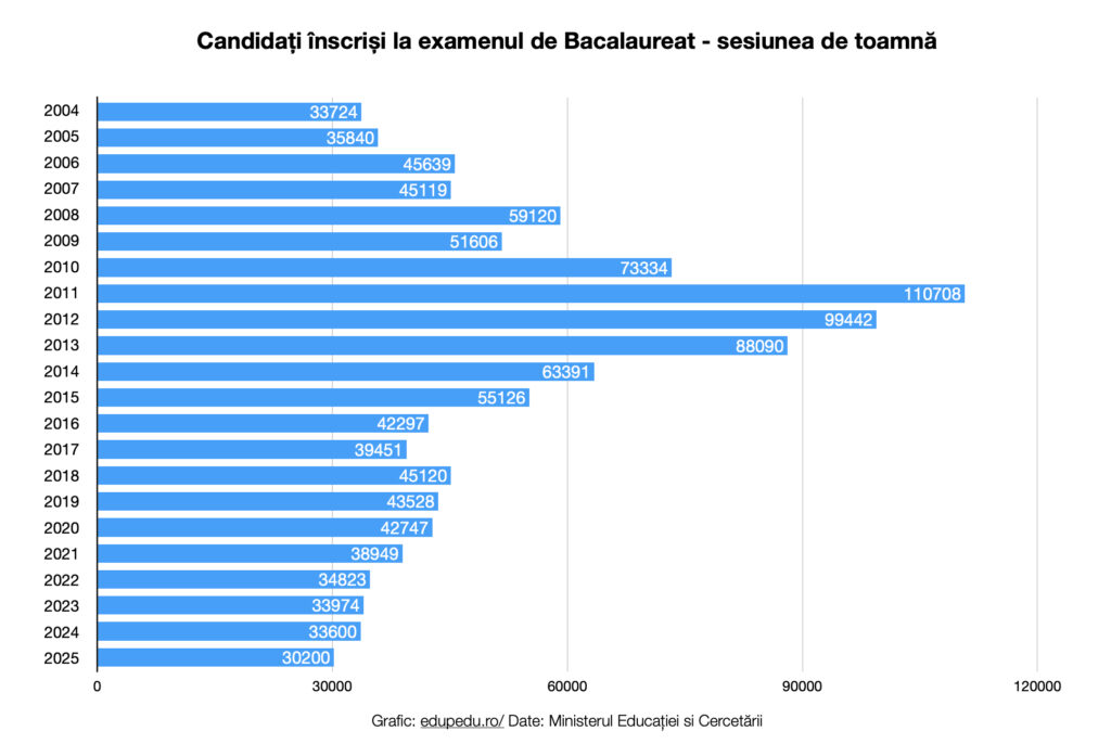Peste 30.200 de absolvenți de liceu s-au înscris la examenul de Bacalaureat de toamnă 2025, cel mai mic număr din ultimii 21 de ani. Peste 18.200 de candidați provin din promoţia curentă, iar circa 12.000 de candidați – din promoţiile anterioare, potrivit unui comunicat al ministerului Educației și Cercetării.