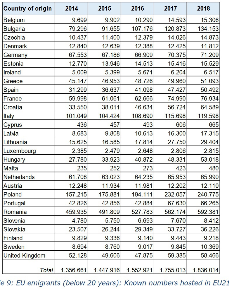 Toate celelalte state au rate de emigrație între 0,5 și 2%. Autorii raportului susțin că s-au confruntat cu date lipsă și că, de fapt, cifrele ar putea fi mult mai dramatice. Dacă datele statistice care lipsesc ar fi proporțional atribuite statelor membre, proporția persoanelor emigrate cu vârsta între 0 și 19 ani ar fi de până la 21% în România, 16% în Bulgaria și de peste 13% în Croația.