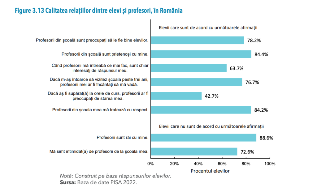 În România, 78% dintre elevi au fost de acord sau total de acord cu faptul că profesorii din școlile lor sunt interesați de starea de bine a elevilor lor și 27% dintre elevi au declarat că se simt intimidați de profesorii din școală. „În medie, la cele opt întrebări specifice incluse în chestionarul PISA 2022, elevii au declarat că se simt, în general, sprijiniți de către profesorii lor (Figura 3.13). Se remarcă faptul că, între 40% și 60% dintre elevi simt nevoia să primească mai multă atenție de la profesorii lor”.