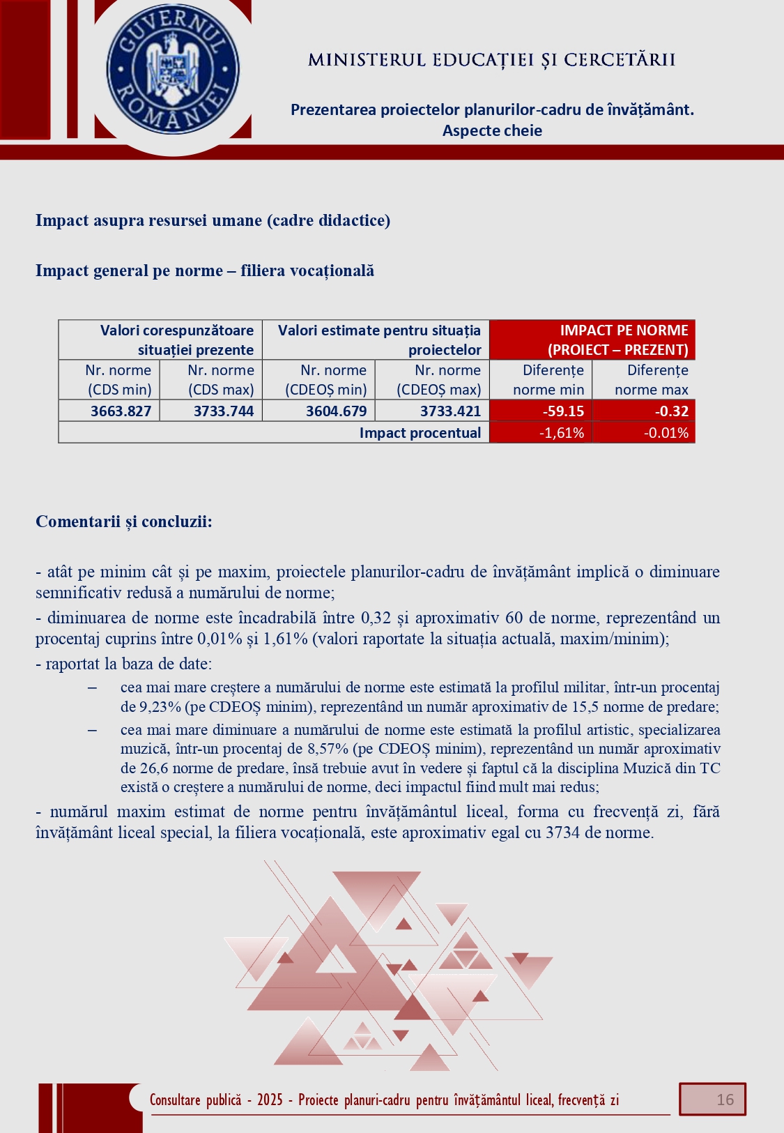 Conform unui document al Ministerului Educației și Cercetării, la filiera vocațională, diminuarea de norme este încadrabilă între 0,32 și aproximativ 60 de norme, reprezentând un procentaj cuprins între 0,01% și 1,61% (valori raportate la situația actuală, maxim/minim).