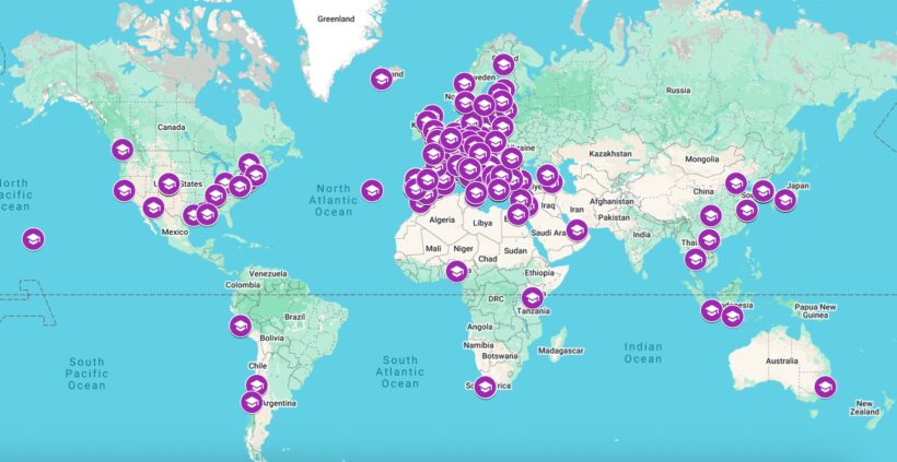 Harta prezintă prezență amplă la evenimente academice din Europa, urmată de o prezență mai redusă în SUA, dar și de unele prezențe în Asia de Est și Sud-Est și câteva în America de Sud, Africa, Orientul Mijlociu și Asia.