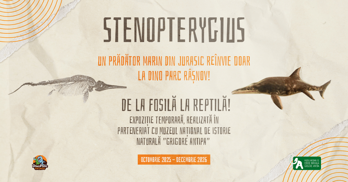 Fidel misiunii sale educative, Dino Parc Râșnov invită cadrele didactice din toată țara să își aducă elevii într-o experiență unică, unde știința se împletește cu spectacolul. În perioada octombrie 2025 – decembrie 2026, parcul găzduiește expoziția temporară „Stenopterygius quadriscissus – de la fosilă la reptilă”, realizată în colaborare cu prestigiosul Muzeu Național de Istorie Naturală „Grigore Antipa”.