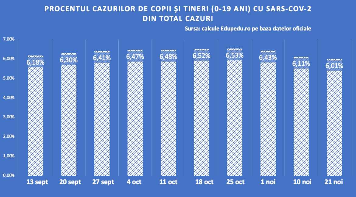 Analiza datelor oficiale arată că procentul cazurilor la copii și tineri, cu vârste între 0-19 ani, în numărul total de cazuri de infectare cu Sars-CoV-2 a scăzut cu 0,1 puncte la 14 zile după închiderea generalizată a școlilor din România și trecerea lor la învățământ 100% online. Scăderea nu este una de amploare, dar statistic este cea mai mică valoare procentuală înregistrată de la 14 septembrie până acum.