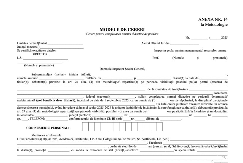 În vederea soluționării completărilor de normă didactică de predare, la nivel județean/nivelul municipiului București, cadrele didactice depun, în data de 14 august 2025, între orele 9-13 cerere, însoțite de documentele justificative, la inspectoratul școlar (sediul C.S.Ș. Miercurea Ciuc, str. Toplița nr. 20, camera 201).