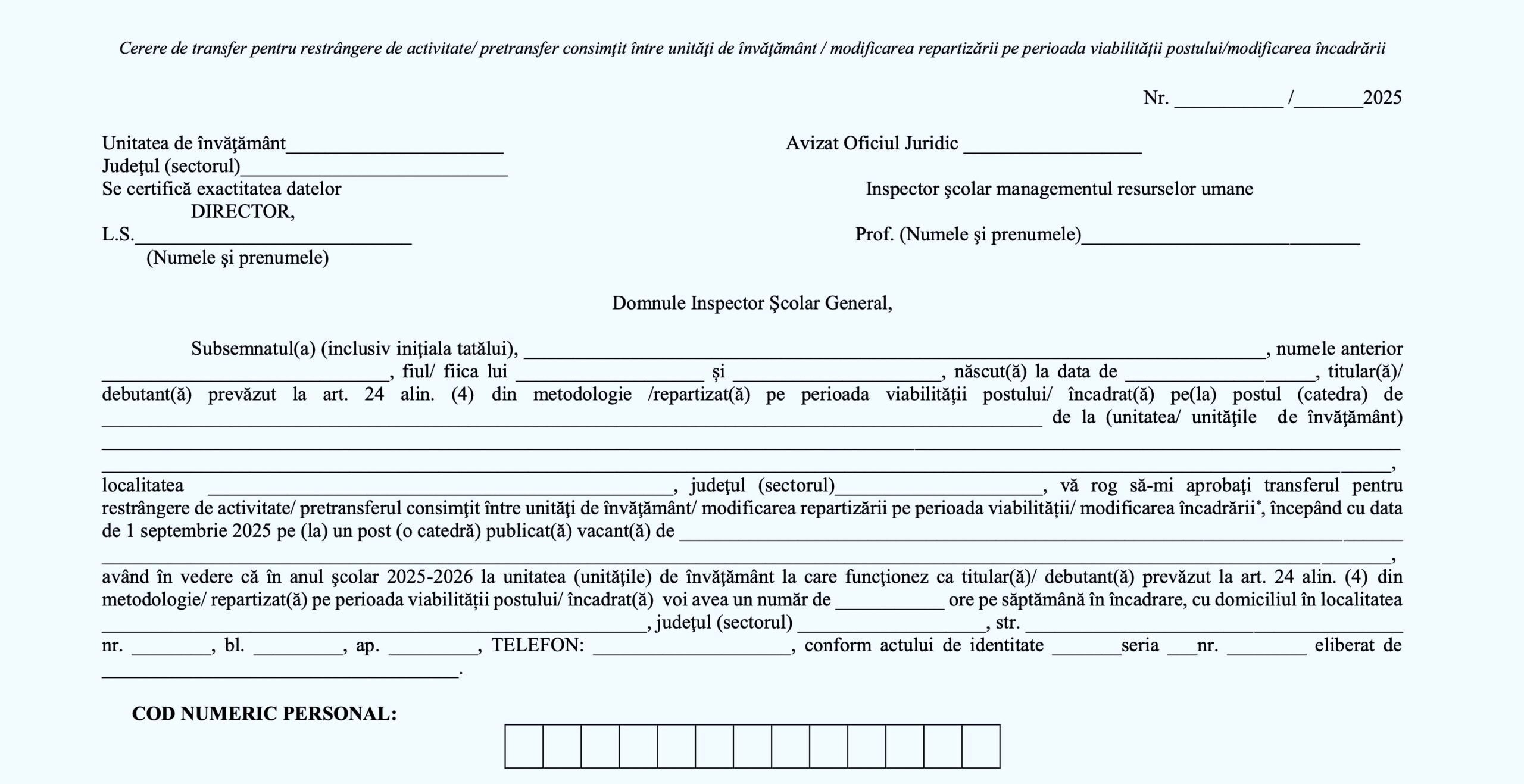 Cererea tip pentru soluționarea cererilor de restrângere de activitate pentru personalul didactic pentru anul școlar 2025-2026