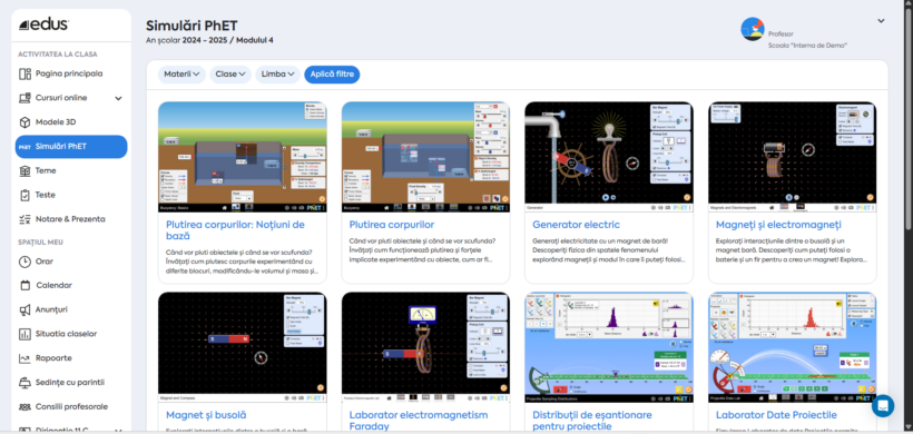 Integrarea PhET în EDUS răspunde nevoii tot mai mari de digitalizare a educației. EDUS s-a născut din dorința de a aduce școlile din România în era digitală. Prin platforma noastră, oferim profesorilor și elevilor un ecosistem complet: de la acces la conținut educațional, la cursuri pentru profesori și instrumente digitale pentru predare. Punem la dispoziție echipamente moderne — laptopuri, table interactive, camere de documente, ochelari VR, imprimante 3D și roboței educaționali.