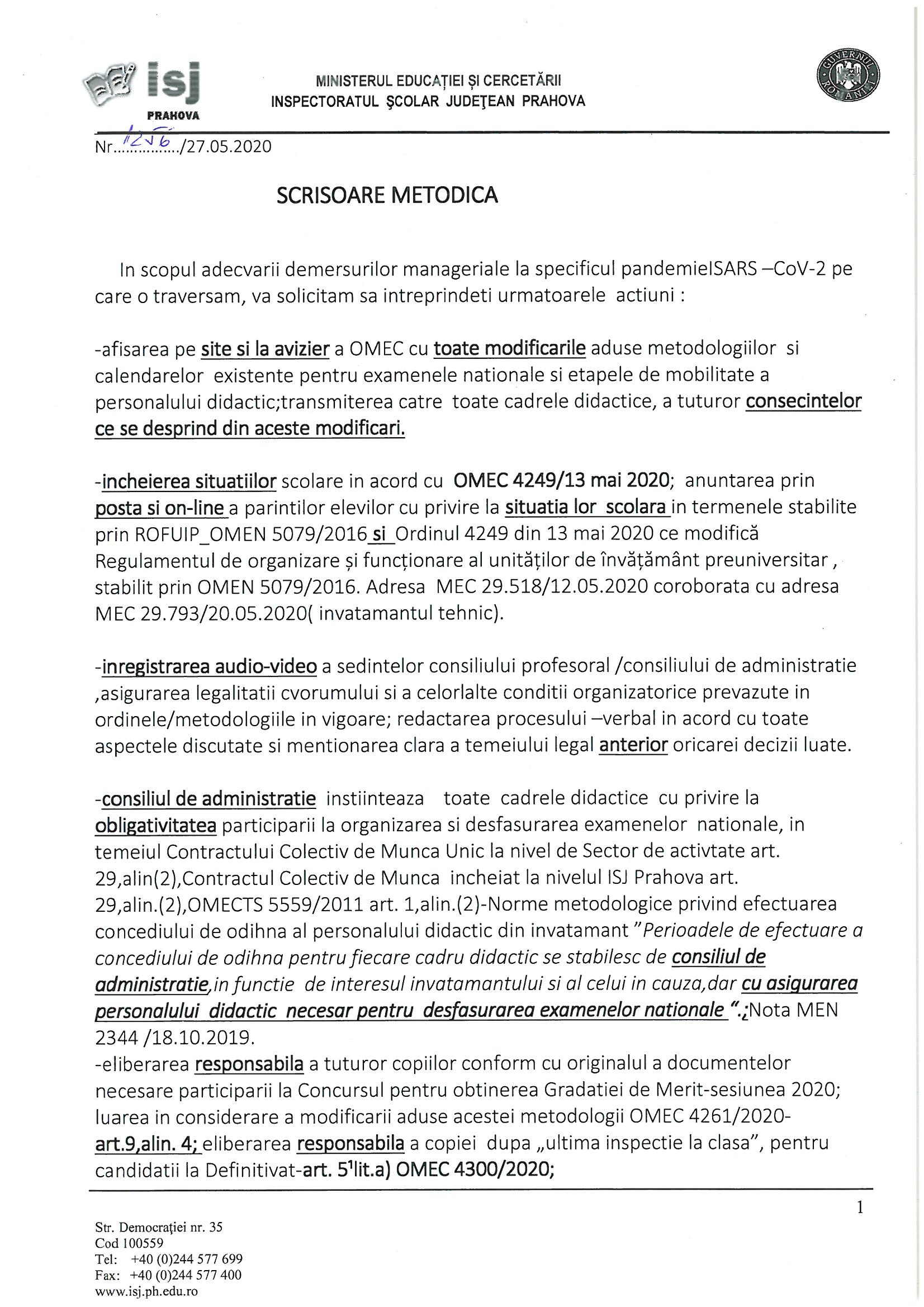 Ce transmite ISJ Prahova în Scrisoarea Metodică nr. 1256 din 27.05.2020