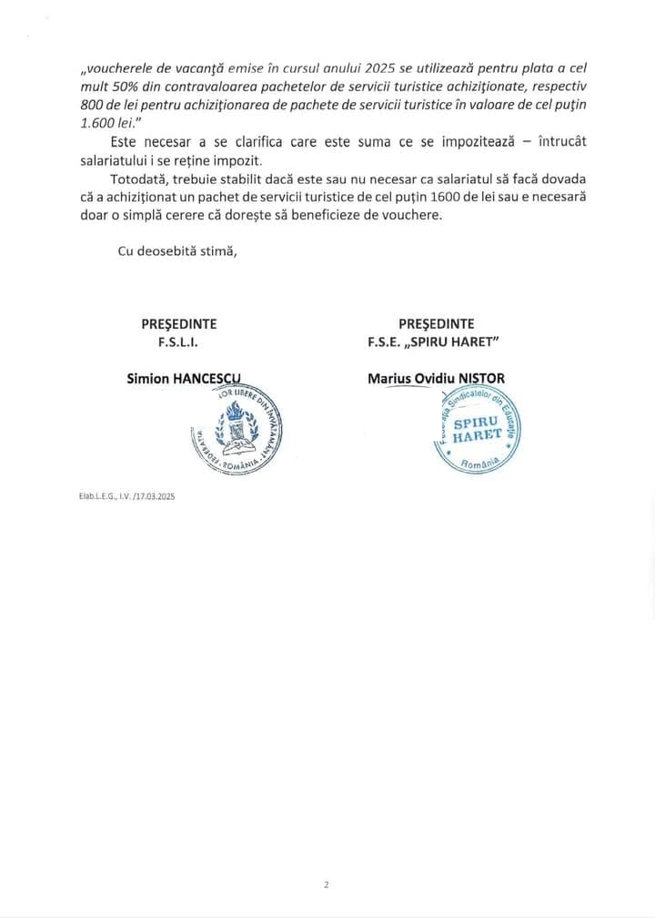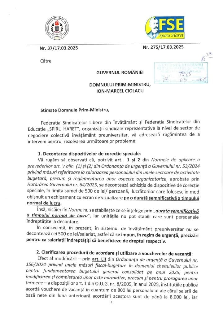 „Federația Sindicatelor Libere din Învăţământ și Federația Sindicatelor din Educație „SPIRU HARET”, organizații sindicale reprezentative la nivel de sector de negociere colectivă învăţământ preuniversitar, vă adresează rugămintea de a interveni pentru rezolvarea următoarelor probleme: