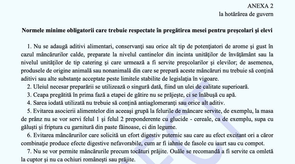 Normele minime obligatorii care trebuie respectate în pregătirea mesei pentru preşcolari şi elevi sunt precizate în anexa 2: