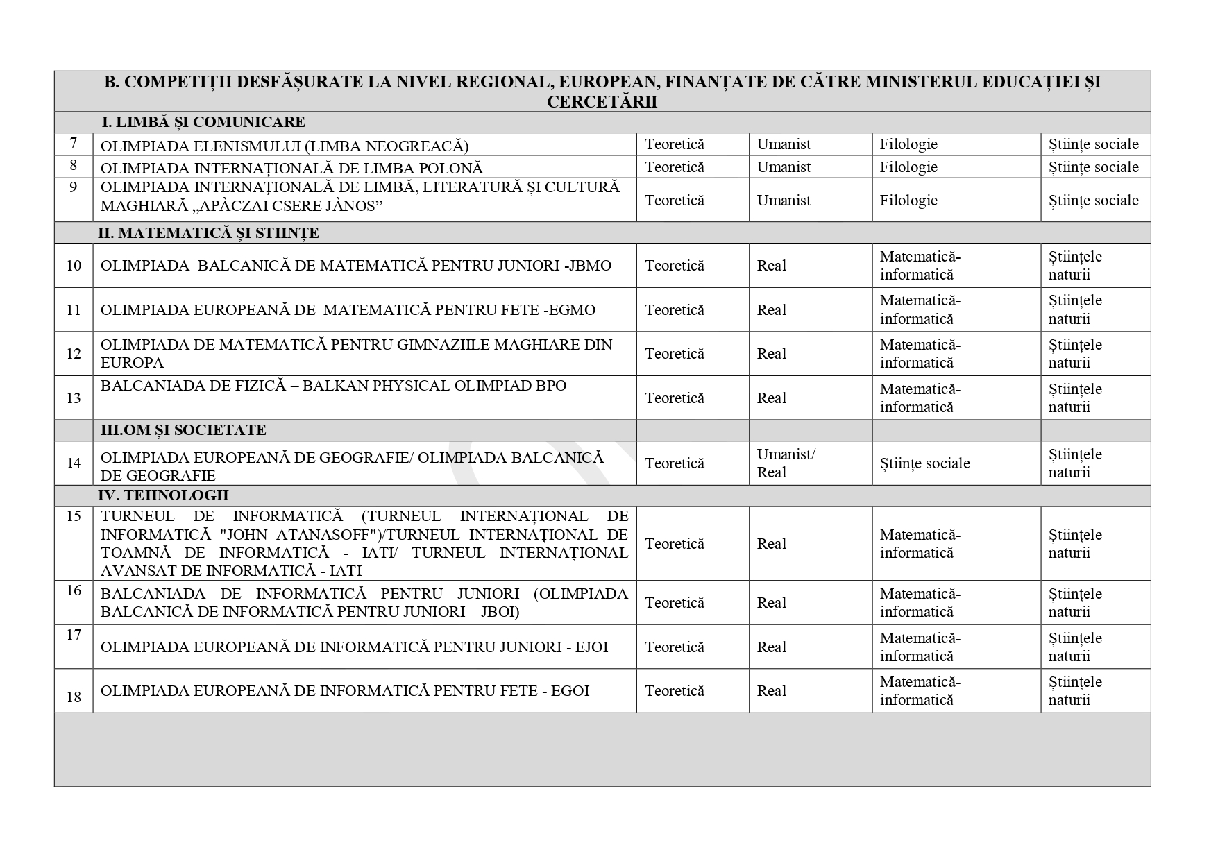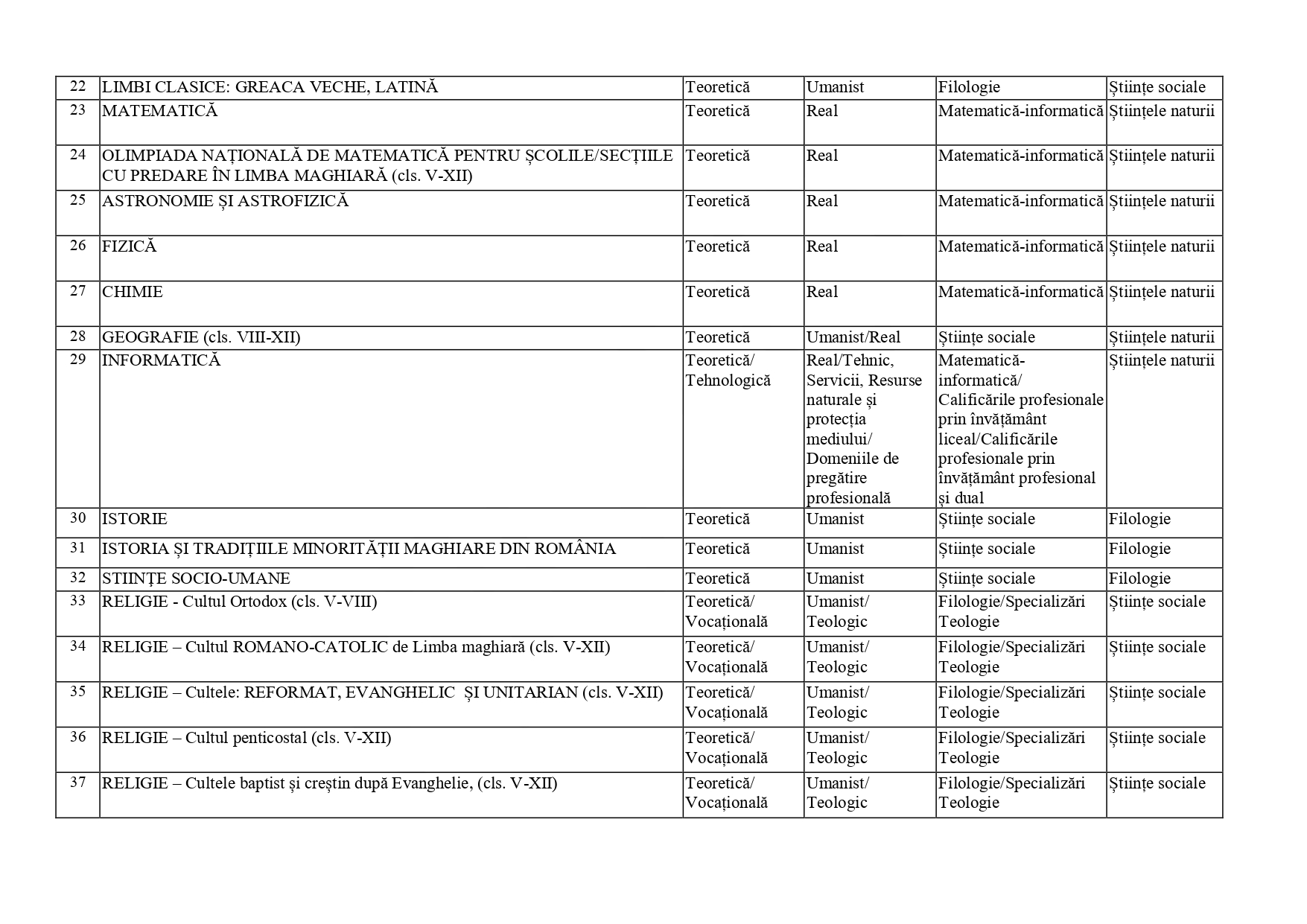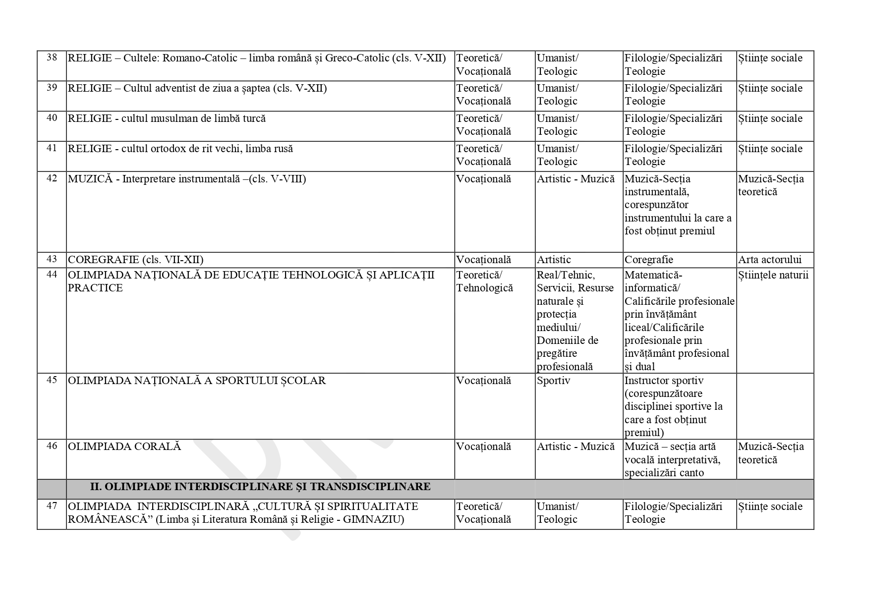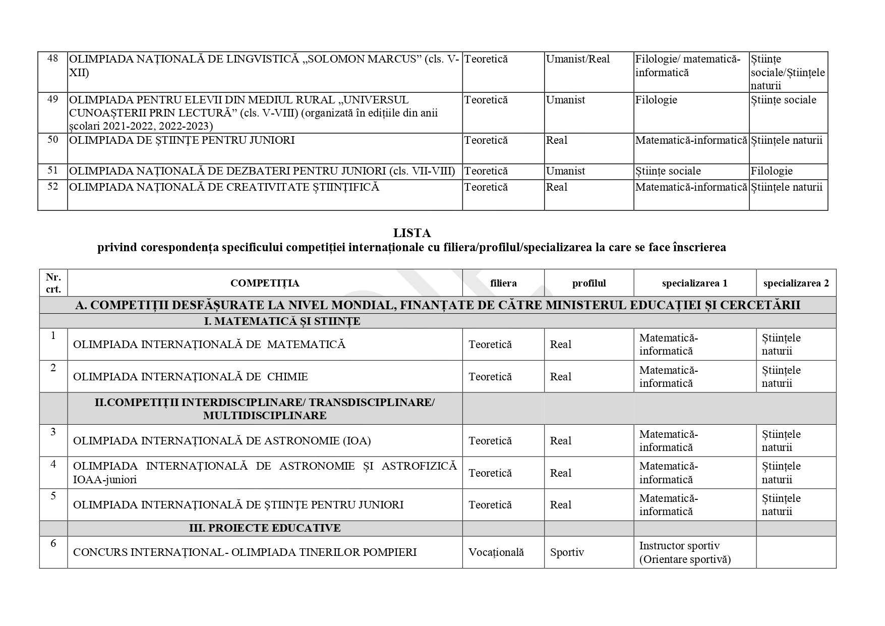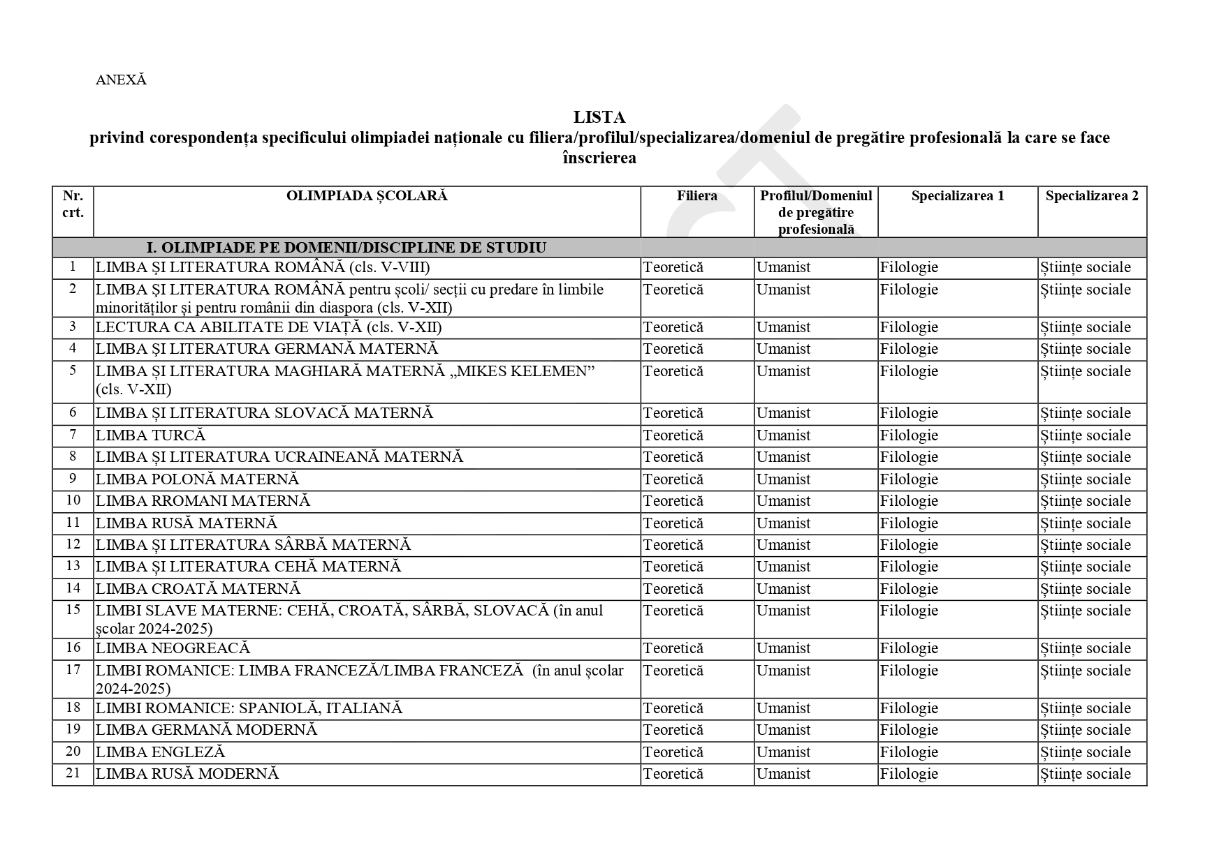 FOTO DOCUMENT Anexă – lista corespondențelor olimpiadă – specializare liceu, admitere 2025: