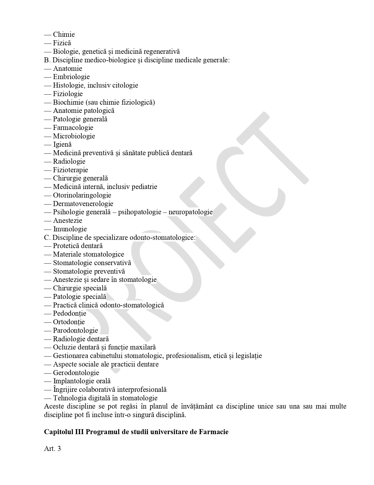 Documentul include și prevederi pentru o componentă de digitalizare extinsă: sunt introduse explicit discipline precum „tehnologii digitale în medicină și farmacie”, „stomatologie digitală”, „e-sănătate”, „gestionarea datelor digitale”.