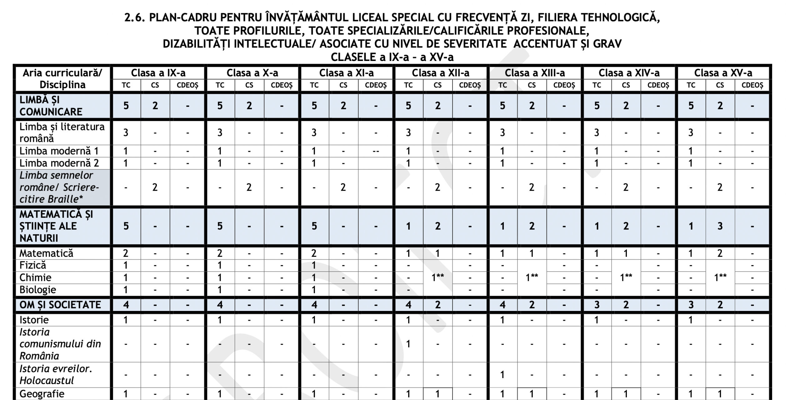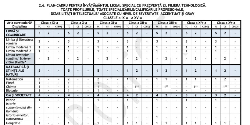 Planul-cadru pentru învățământul liceal special cu frecvență zi, filiera tehnologică, toate profilurile, toate calificările profesionale, dizabilități senzoriale și dizabilități intelectuale cu nivel de severitate ușor și mediu, clasele a IX-a – a XIV-a;