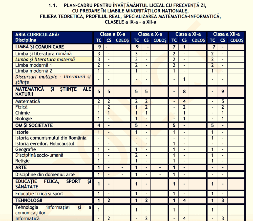 Conținuturile prevăzute pentru clasele IX–XI (forma cu frecvență zi) sunt distribuite în primii trei ani și jumătate* (clasele IX, X, XI și prima jumătate a clasei a XII-a), iar cele pentru clasa a XII-a zi sunt parcurse în a doua jumătate a clasei a XII-a și în clasa a XIII-a.