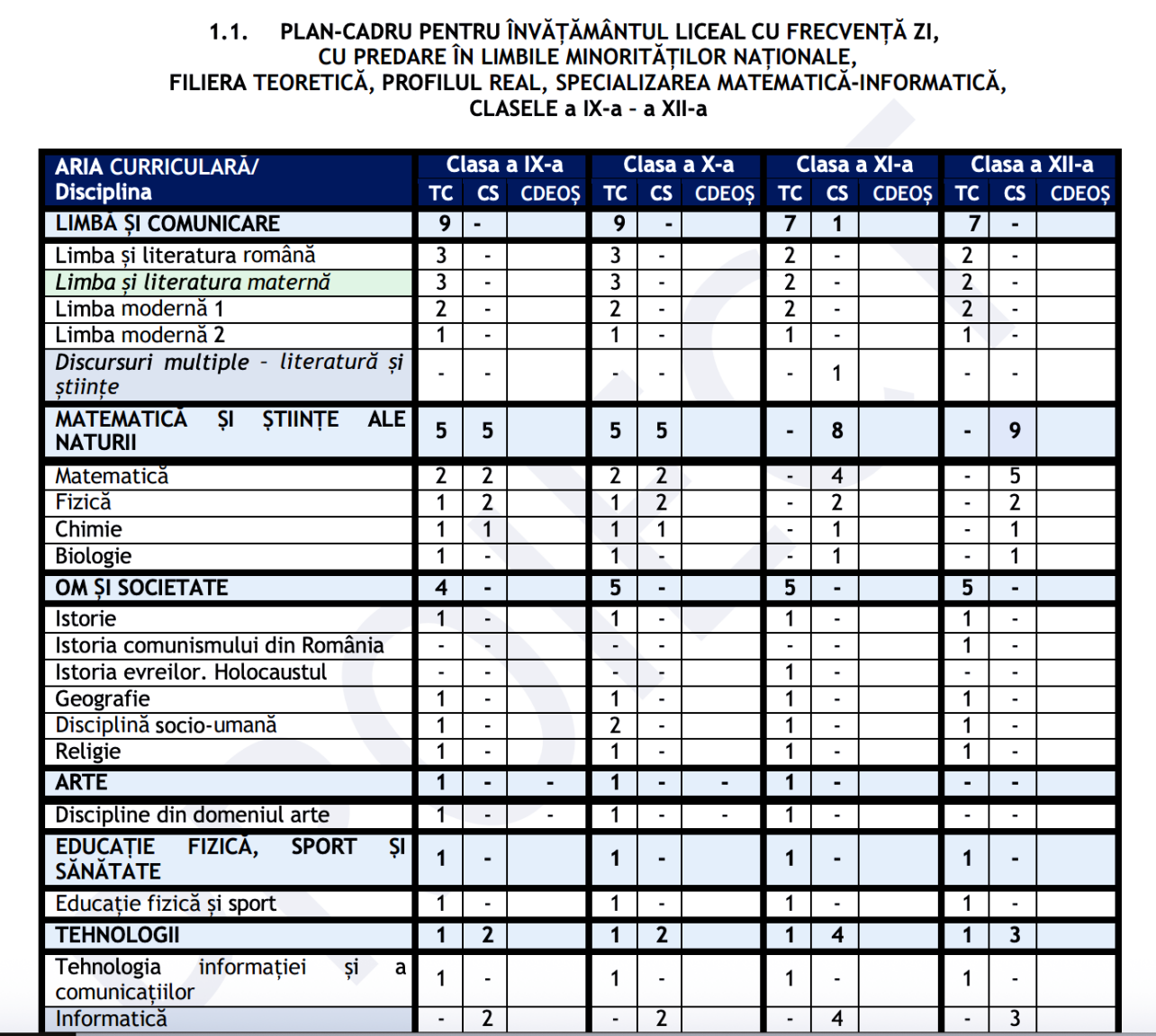 • nicio oră în trunchiul comun la clasele a XI-a și a XII-a, cu o oră de CS la ȘTIAM la clasa a XII-a