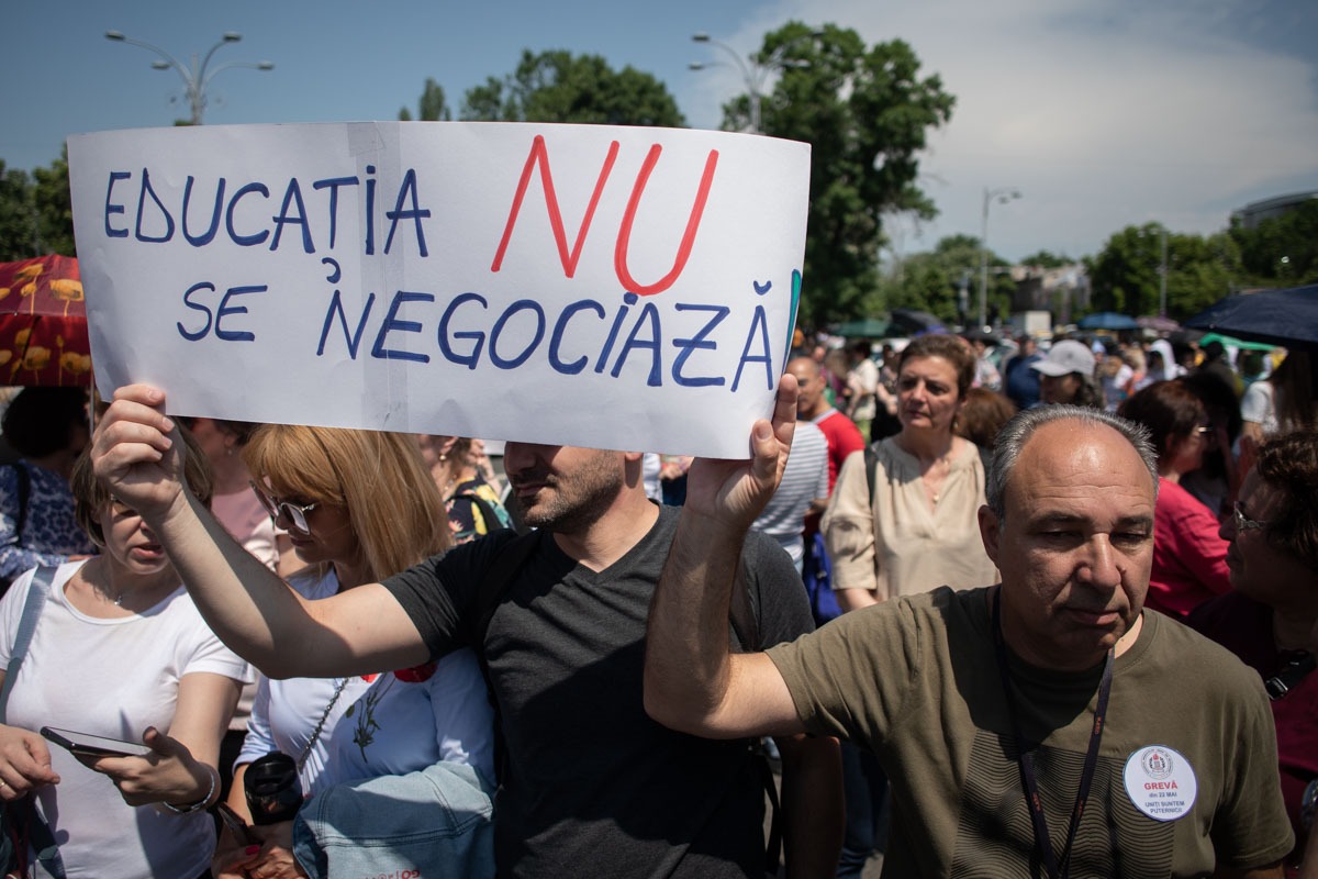 Demonstranții au scandat „Respect, nu umilință”, „Școli și clase comasate = Partide Suprafinanțate”, „Guvernul îngroapă educația”, „Universitari, alăturați-vă grevei!”, relatează publicația.