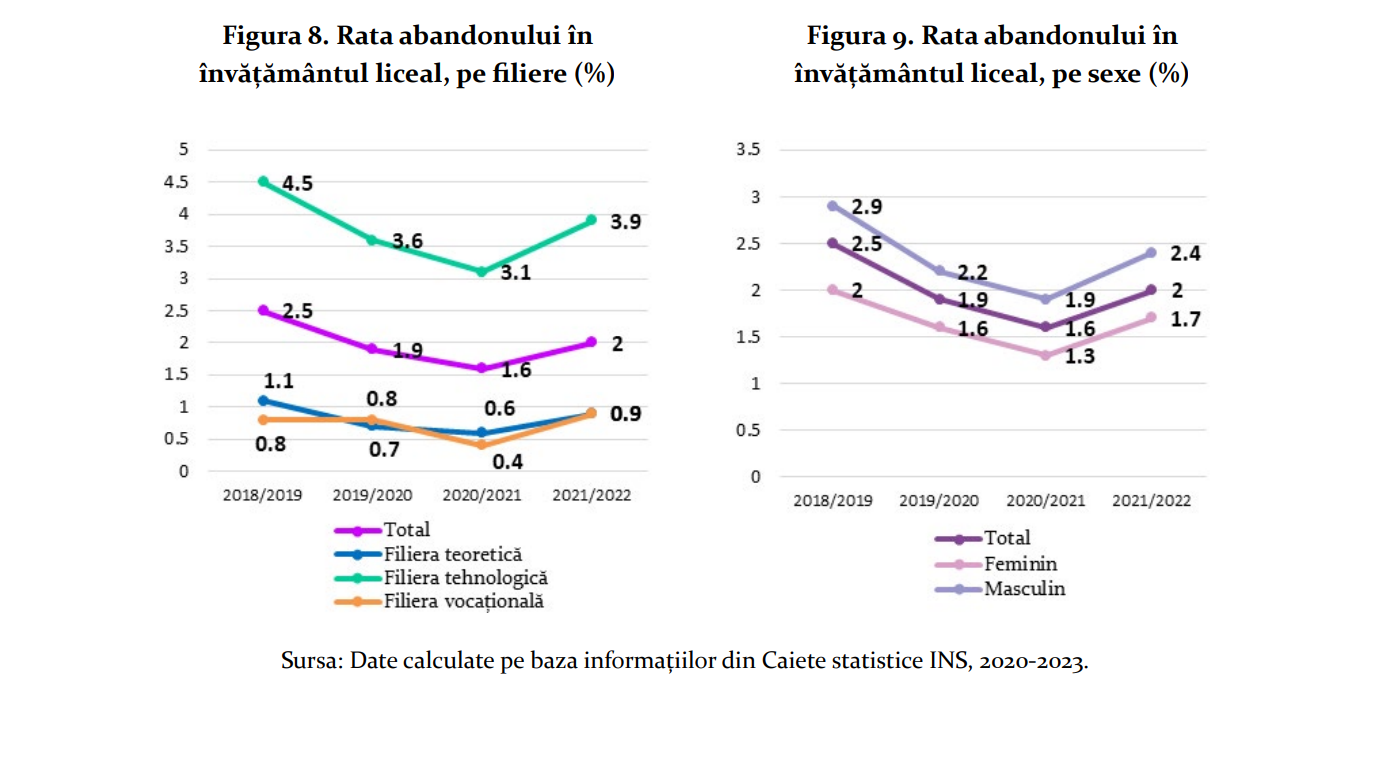 În perioada pandemiei, valoarea abandonului școlar a scăzut de la 2,5% în 2018-2019 la 1,6% în 2020-2021. „Scăderea valorii indicatorului poate fi asociată cu efecte ale perioadei pandemice, când elevii s-au confruntat mai puțin cu dificultățile legate de transport și de cazare datorită desfășurării online a orelor (cazul celor care sunt școlarizați în altă localitate”, potrivit raportului.
