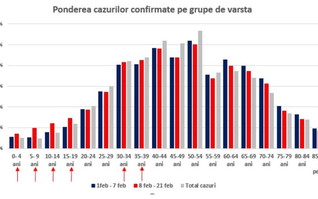 Potrivit raportului, în perioada 8-21 februarie, adică de la deschiderea școlilor, ratele de incidență săptămânală au crescut majoritar în grupa de vârstă 0-19 de ani și în grupa de vârstă 20-39 de ani. În grupele de vârsta de peste 40 de ani s-au înregistrat scăderi ale ratei de incidență.