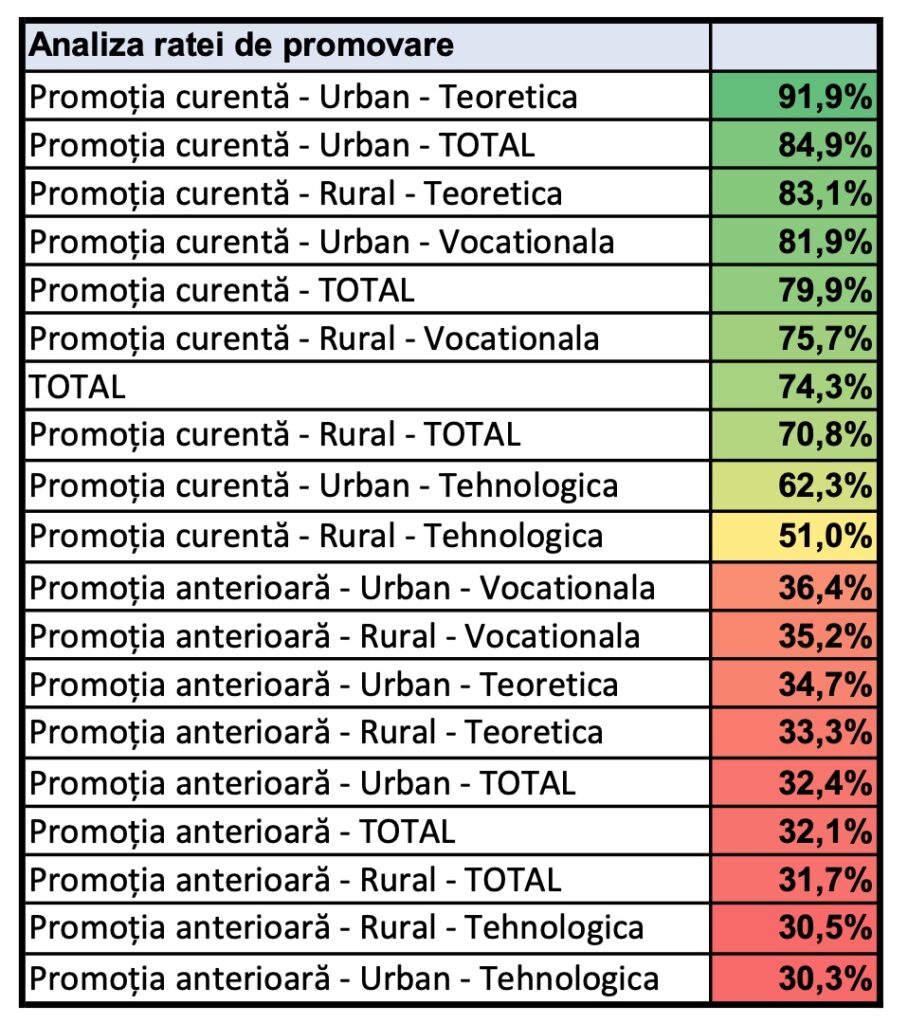 La nivelul promoției curente, rata de promovare în orașe a fost de 84,9%, iar în mediul rural ea a fost de 70,8%.