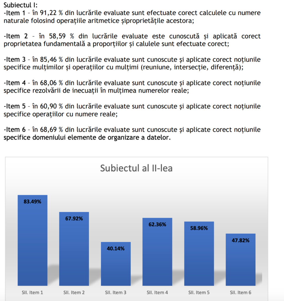 La subiectul I, despre care statistica Ministerului Educației la nivel național arată că 1 din 5 elevi nu au știut să îl rezolve, în București, 91% dintre elevi au obținut punctaj maxim. Este vorba despre exercițiul de clasa a II-a cu ordinea operațiilor.
