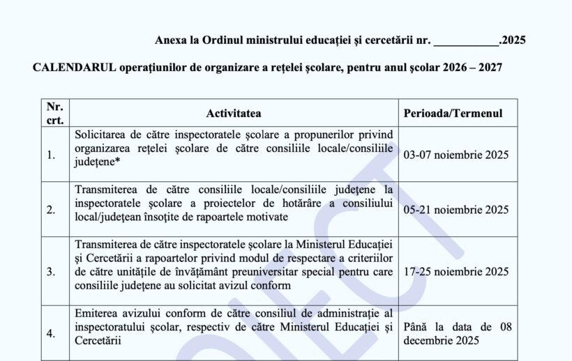 În perioada 3-7 noiembrie încep activitățile de reorganizare a școlilor și pentru rețeaua școlară 2026-2027, iar inspectoratele școlare vor fi obligate să publice online lista școlilor până la 23 februarie 2026, conform calendarelor pentru reorganizarea unităților de învățământ și organizarea rețelei școlare 2026-2027, puse în consultare publică de către ministerul Educației și Cercetării.