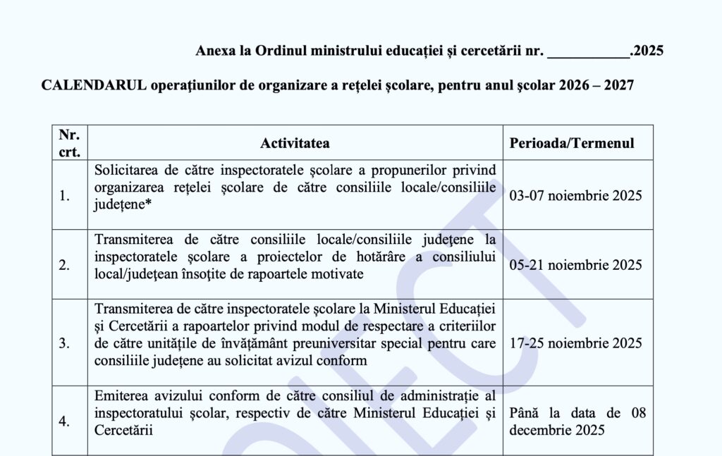 - Procesul de organizare a rețelei școlare pentru 2026–2027 începe pe 3 noiembrie 2025.