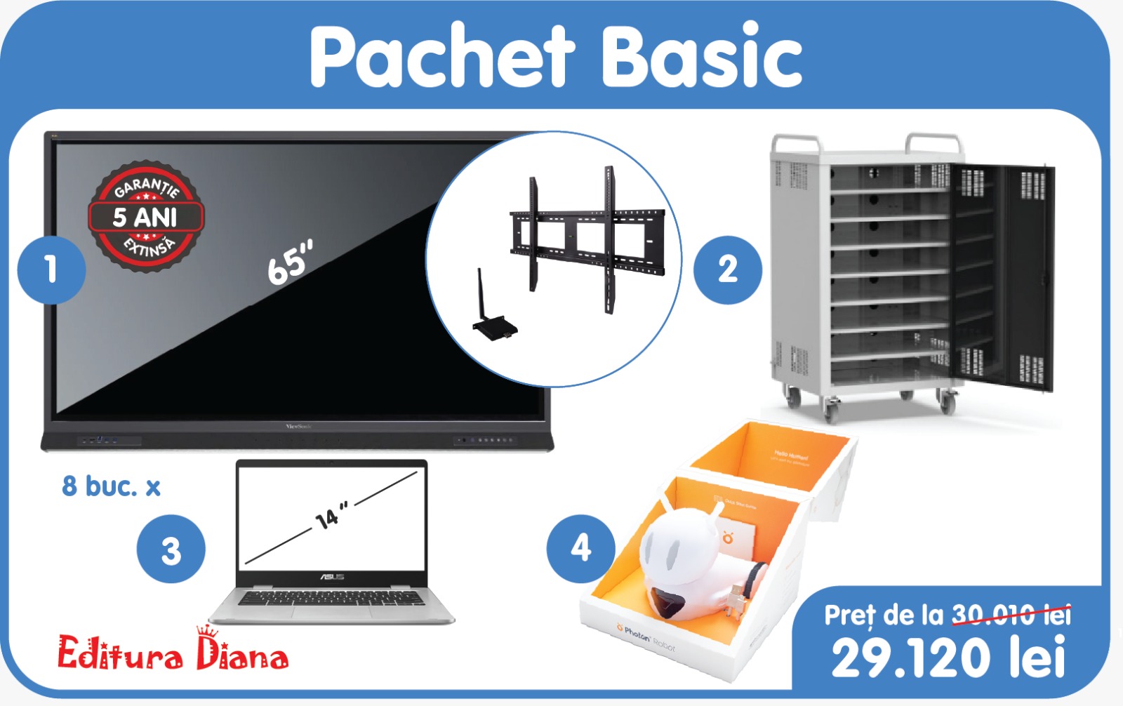 Pachetul Basic – format dintr-un display interactiv ViewSonic, cu platformă de învățare MyViewBord, suport de perete și modul wireless gratuit, o stație de încărcare mobilă pentru 16 dispozitive, 8 x laptop ultraportabil și un robot programabil educativ Photon.