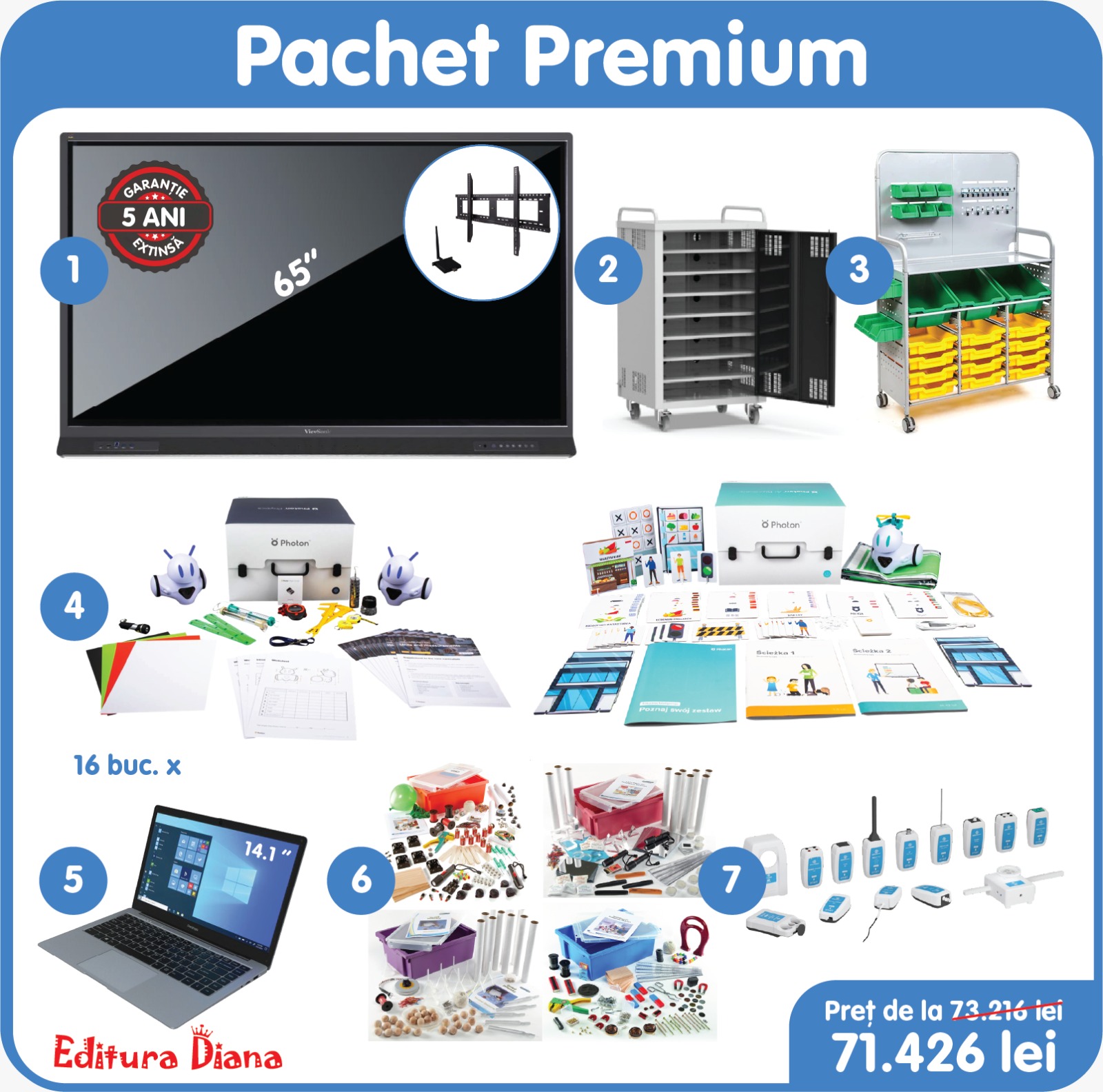 Pachetul Premium – format dintr-un display interactiv ViewSonic, cu platformă de învățare MyViewBord, suport de perete și modul wireless gratuit, o stație de încărcare mobilă pentru 16 dispozitive, un cărucior multifuncțional MakerSpace, un set de 2 kit-uri educaționale cu robotul Photon, 16 x laptop ultraportabil, un set de 4 kit-uri pentru experimente științifice și un set 15 dispozitive de măsurare cu soft integrat pentru biologie, chimie și fizică.