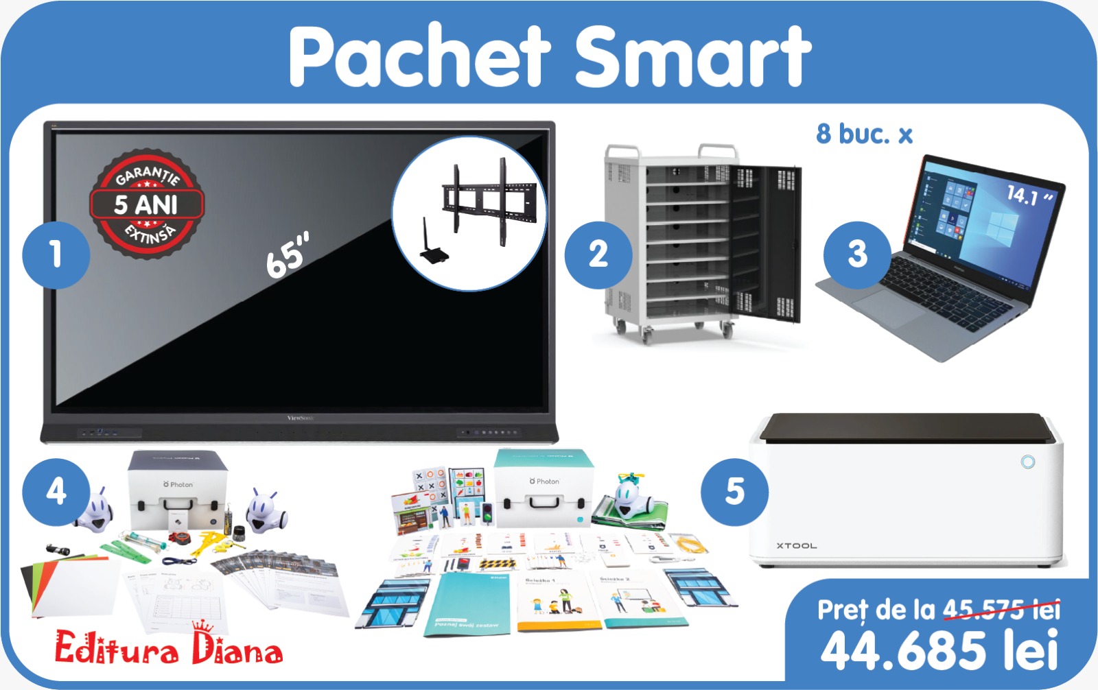 Pachetul Smart – format dintr-un display interactiv ViewSonic, cu platformă de învățare MyViewBord, suport de perete și modul wireless gratuit, o stație de încărcare mobilă pentru 16 dispozitive, 8 x laptop ultraportabil, un set de 2 kit-uri educaționale cu robotul Photon și o mașină inteligentă hibrid, cu laser și cuțit pentru tăiere și gravare.