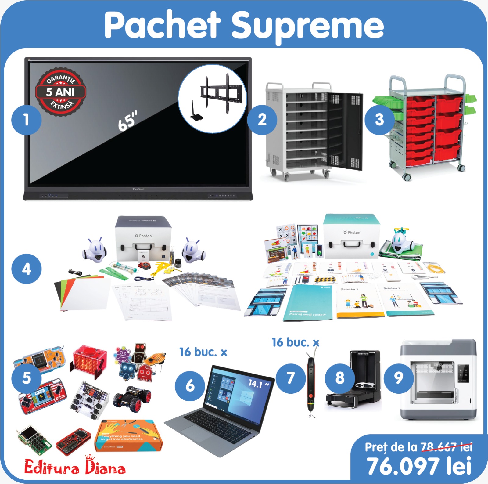 Pachetul Supreme – format dintr-un display interactiv ViewSonic, cu platformă de învățare MyViewBord, suport de perete și modul wireless gratuit, o stație de încărcare mobilă pentru 16 dispozitive, un cărucior multifuncțional STEM, un set de 2 kit-uri educaționale cu robotul Photon, un set de 9 kit-uri de robotică pentru practică electronică, 16 x laptop ultraportabil, 16 x Creion 3D, un scaner 3D și o imprimantă 3D monocrom.