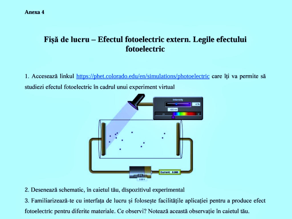 Fișa de lucru propusă are 7 cerințe centrate pe efectul fotoelectric extern și legile acestuia. Pentru a rezolva primul exercițiu, elevul va trebui să studieze efectul în cadrul unui experiment virtual.