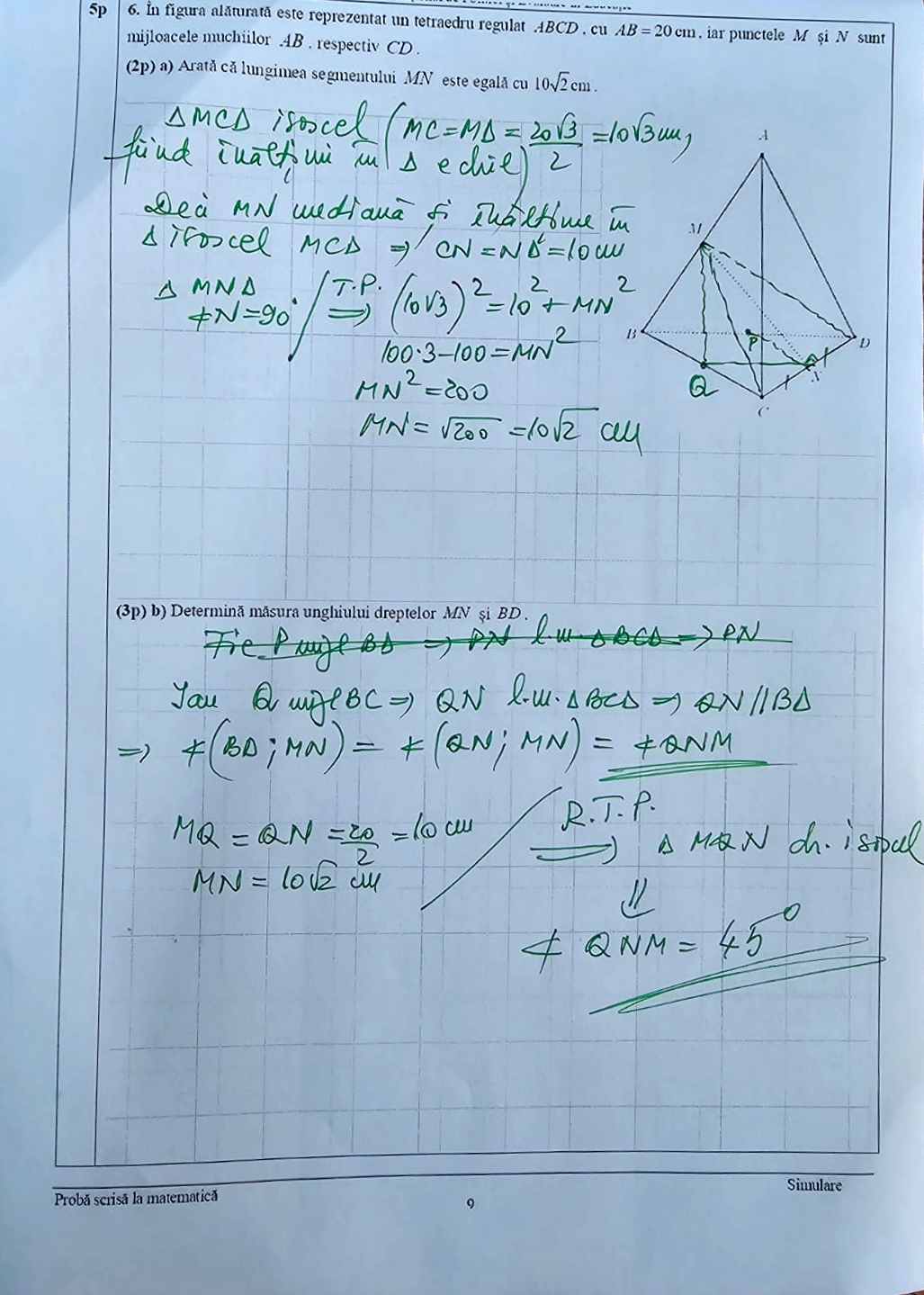 Totusi, problema a fost destul de usoara deoarece daca stiati ca ung(a,b) = ung(c,b), a e paralel cu b era clar ca trebuia sa duci o pararela ori lui bd, ori lui mn.Daca alegi o paralela la mn, dreapta dusa va iesi din plan, deci este evidenta alegerea paralelei la bd, dupa aia se intersecta in mijloc, etc.