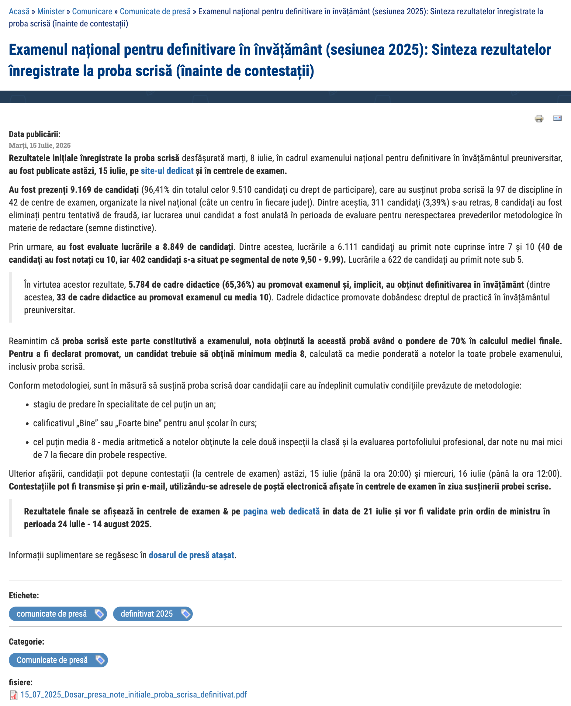 - Tot marți, 15 iulie, în ziua afișării primelor rezultate la DEF 2025, are loc concursul național de ocupare a posturilor / catedrelor în Învățământ (Titularizarea).