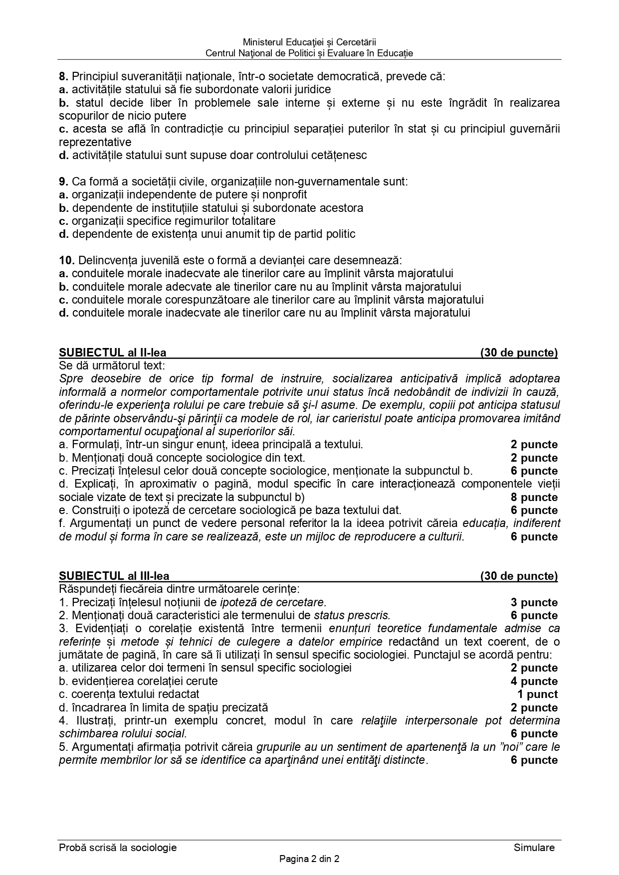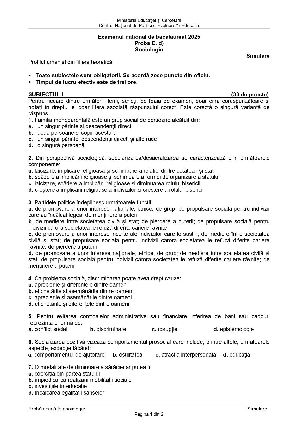 FOTO DOCUMENT Subiect simulare BAC 2025 – Sociologie (sursa) – articolul continuă după imagini: