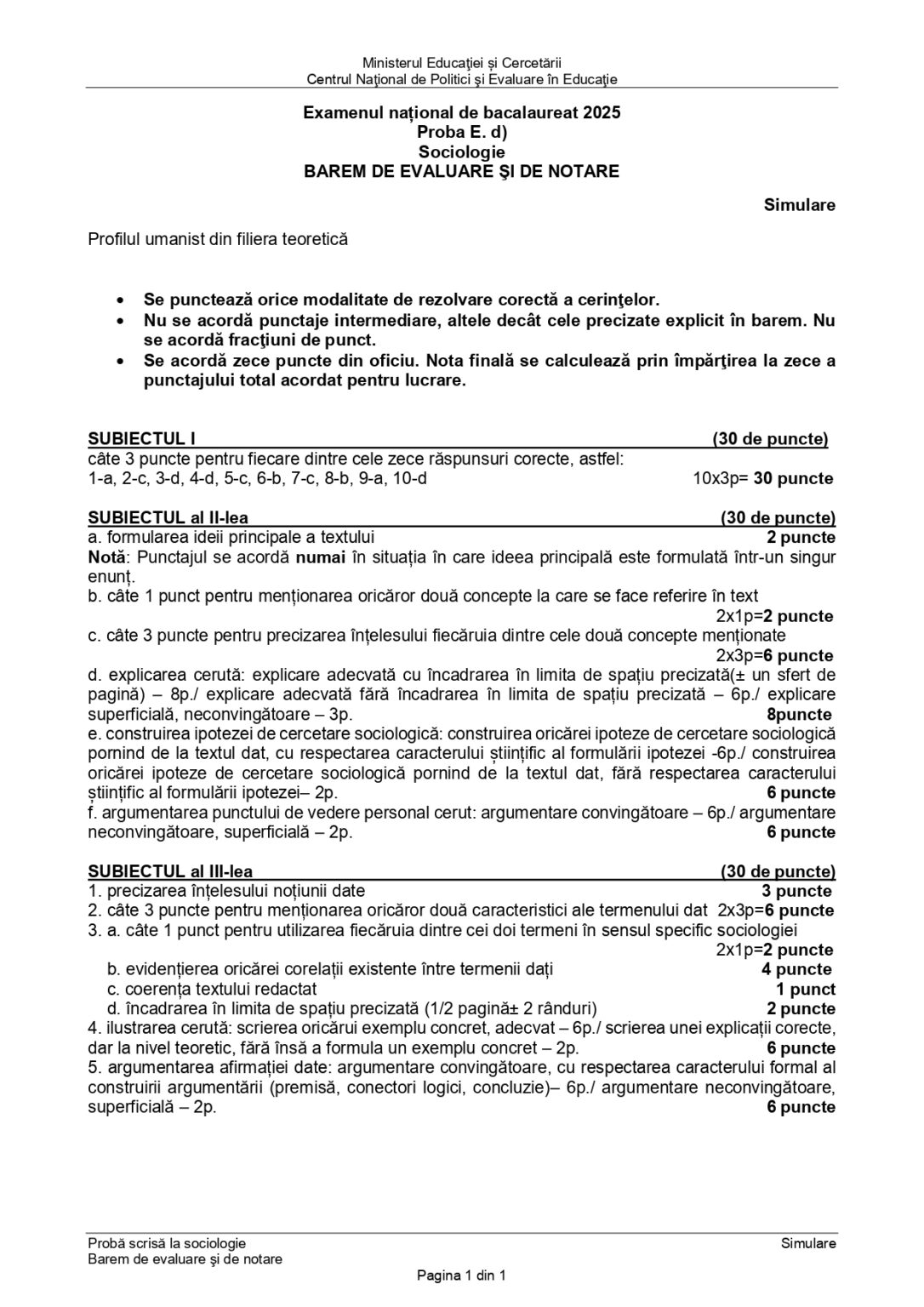 FOTO DOCUMENT Barem simulare BAC 2025 – Sociologie (sursa):