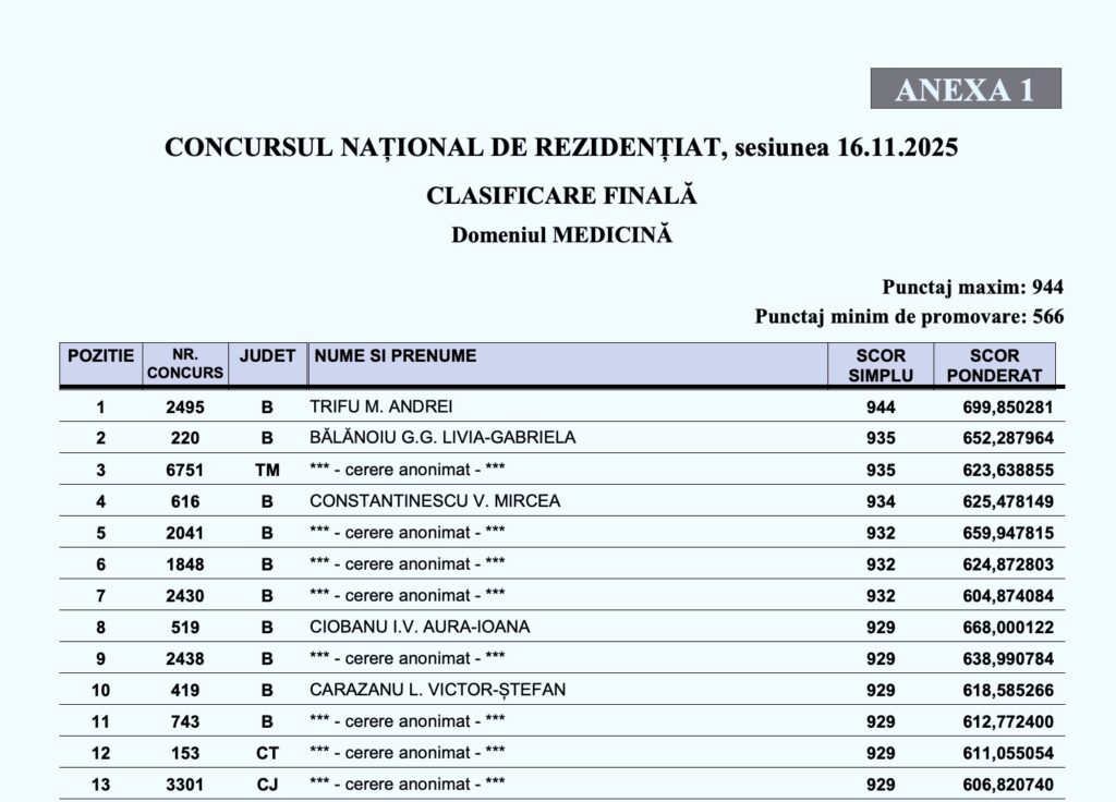 Clasificarea finală a candidaților la Rezidențiat 2025, conform Ministerului Sănătății