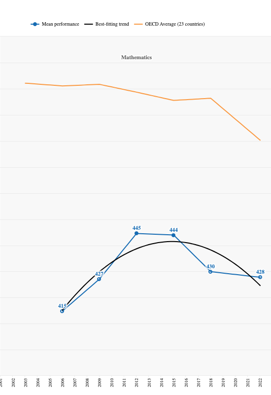 În parcursul testărilor PISA la care România a participat, rezultatele arată că scorul obținut la Matematică în 2022 este al treilea cel mai slab, după cele din 2006 și 2009.