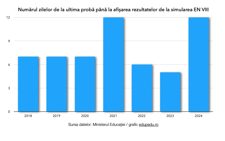 Timpul de 12 zile lucrătoare pentru anunțarea rezultatelor este aproape de maximul prevăzut de legea Deca-Iohannis, care la articolul 106 enumeră printre drepturile elevilor și „dreptul de a fi informat cu privire la notele acordate, înaintea consemnării acestora, la planificarea materiei pe parcursul întregului an școlar, la rezultatele evaluărilor scrise în termen de maximum 15 zile lucrătoare”.