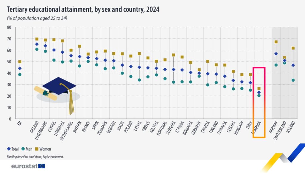 Doar 23,2% dintre românii cu vârste între 25 și 34 de ani au fost, în 2024, absolvenți de studii superioare, un indicator-cheie de măsurare a rezultatelor în educație la nivel european. România se situează, astfel, din nou pe ultimul loc în Uniunea Europeană la acest indicator, cu o rată de aproape două ori mai mică decât media UE, potrivit celor mai noi date Eurostat.