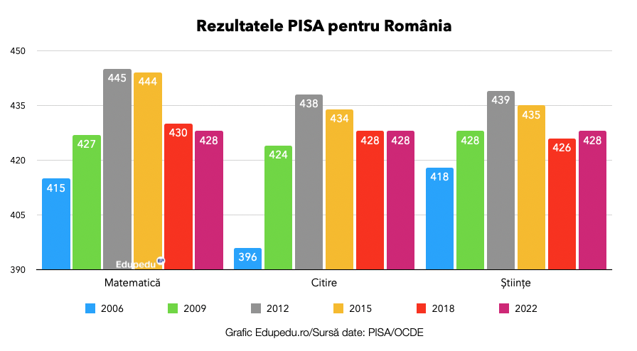 România stagnează față de precedenta sesiune, în privința rezultatelor la testarea standardizată internațională PISA, potrivit datelor publicate marți de Organizația pentru Cooperare și Dezvoltare Economică pentru ediția din 2022 a programului. Țara noastră a obținut 428 de puncte la toate cele trei domenii testate, Matematică, Lectură/Citire și Științe, fiind, în raport cu ea însăși, aproape la același nivel cu cel atins în 2018, considerat cel mai slab din 2009 încoace.